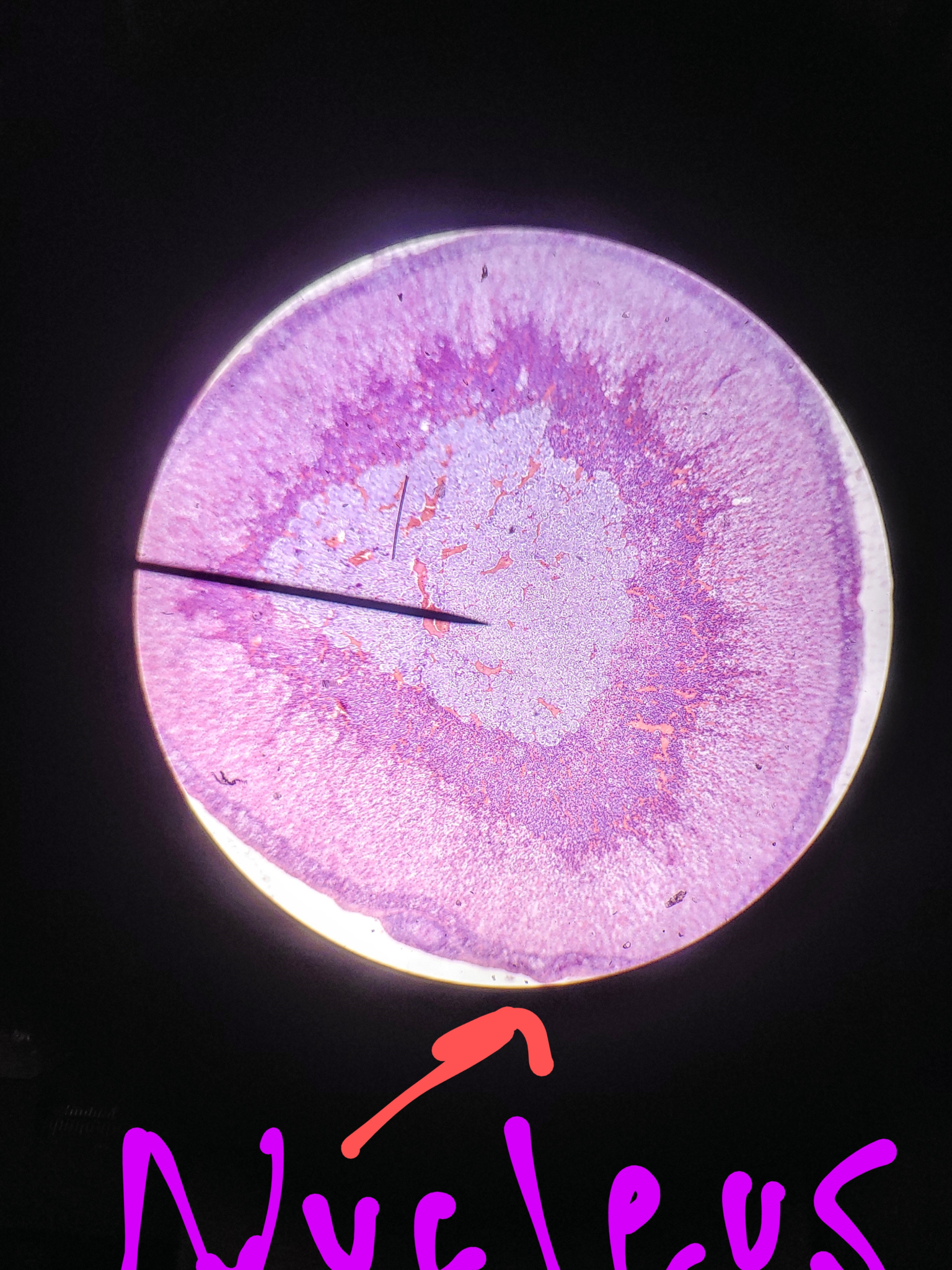 The picture above is a picture of Fibrocartilage through a microscope. The fibers in Fibrocartilage are dense like hairs. The nuclei in Fibrocartilage are in little clusters/lines. The purple dots in the Fibrocartilage is called chondrocytes which is the nuclei in the tissue.